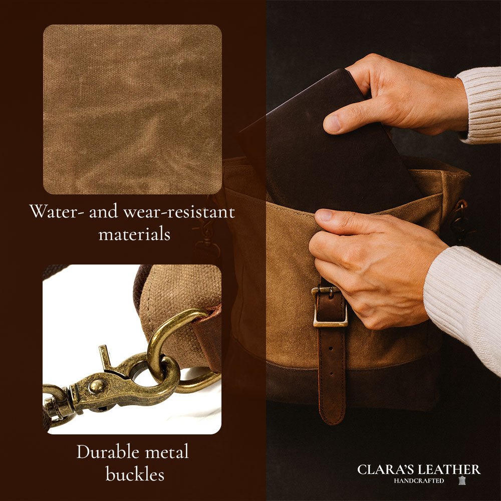 • Durable and Long-Lasting: Crafted from woven waxed cotton canvas and cowhide crazy horse leather, William is designed for resilience. Its rugged materials resist wear, water, and time—growing in character with every journey.